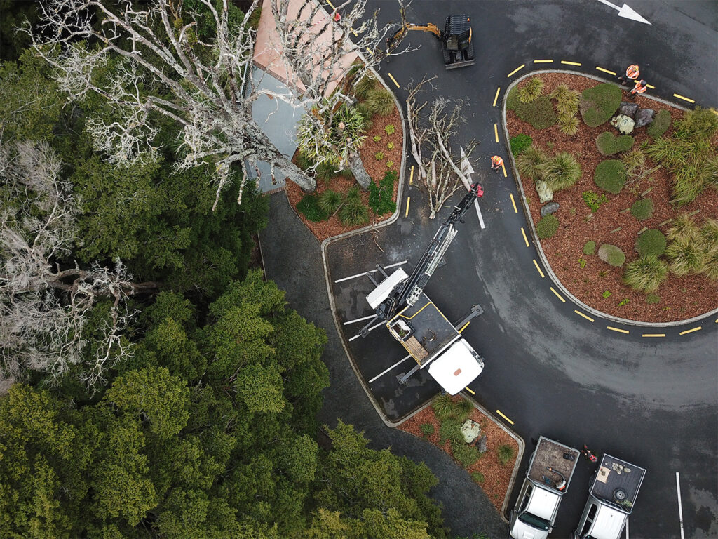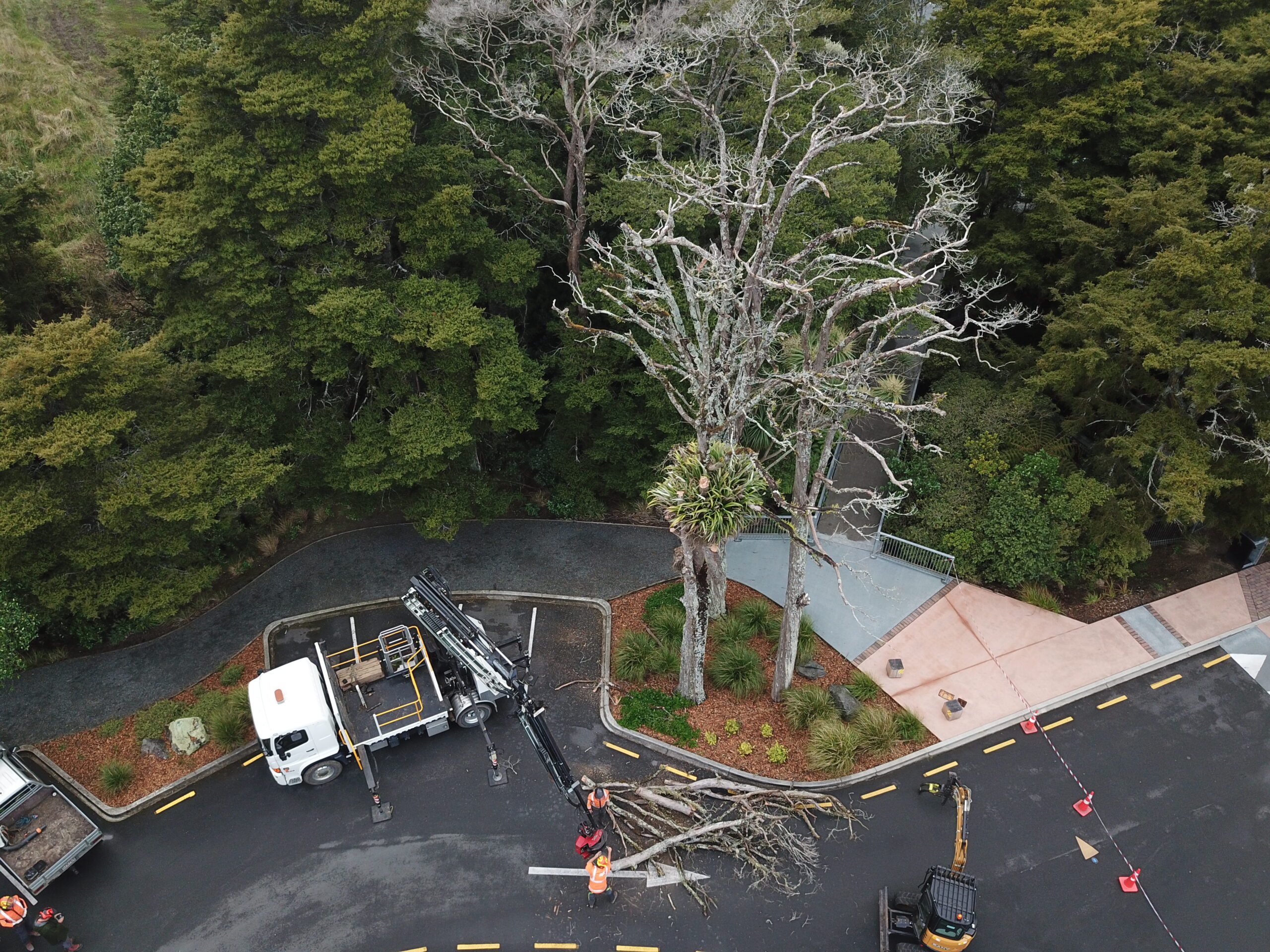 Arborist 360 recently undertook a critical project at Kowhai Park in Warkworth, focused on the removal of several large Tōtara trees that were identified as hazardous. The primary challenge on this job was the poor health of the trees; many were too dead and unstable to be safely climbed by an arborist. To address this risk, we deployed a crane to access and dismantle the Tōtara, ensuring each section was safely lifted clear. Importantly, the main trunks of the Tōtara trees were salvaged and saved for the local council, who plan to reuse this valuable timber within the park. As the team was working in a highly visible and well-used public space, the health and safety of the public was our paramount concern. We meticulously implemented correct blocking off and demarcation of the public walkways, successfully executing the difficult removals while maintaining public safety throughout the entire process, with all brush being efficiently mulched on site.