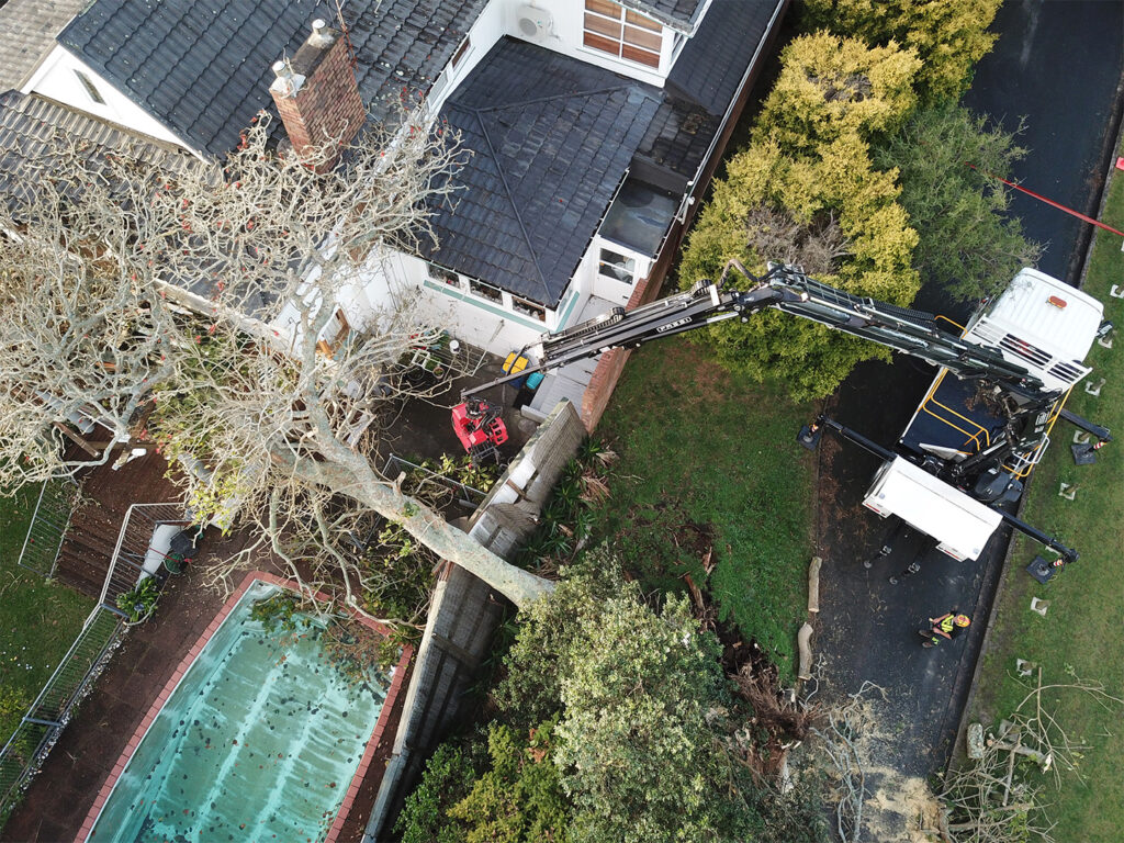 Arborist 360 provided a critical emergency response for a homeowner in Takapuna, Auckland, following a severe storm where a massive 35-meter tree fell directly onto their house. Due to the critical nature of the structural damage and the ongoing risk to the property, a rapid response was essential; our team arrived on the scene and began assessment within two hours of receiving the call. The core challenge was removing the enormous weight of the tree without causing further damage to the compromised structure beneath. We utilised a Hiab crane to surgically lift and section the tree in a controlled manner, piece by delicate piece, ensuring the successful and safe removal of the hazard without exacerbating the damage to the home. This swift and precise operation secured the site and allowed the homeowners to begin the repair process immediately.